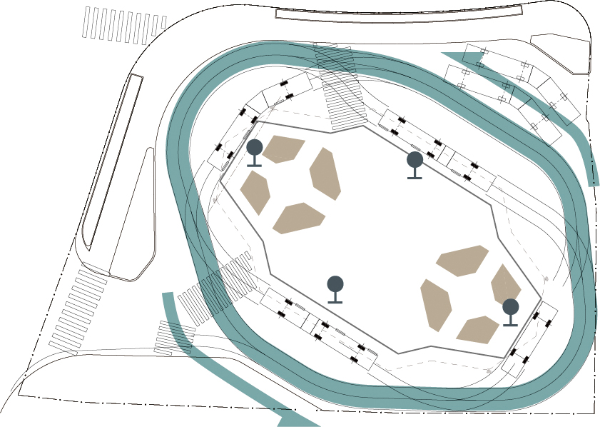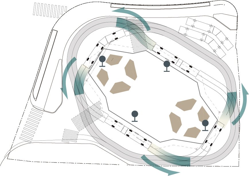 一般的なバスロータリーは時計回りにバスが走り、ロータリーの外側から人が乗り降りをする。これに対し、今回のロータリーはバス導線を反時計回りにして、ロータリーの内側から人が乗り降りするように設定した。