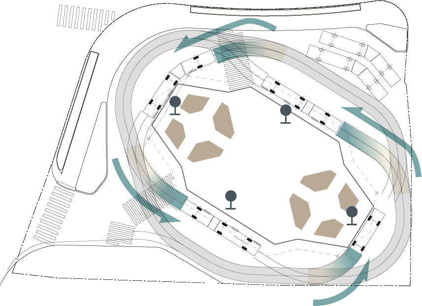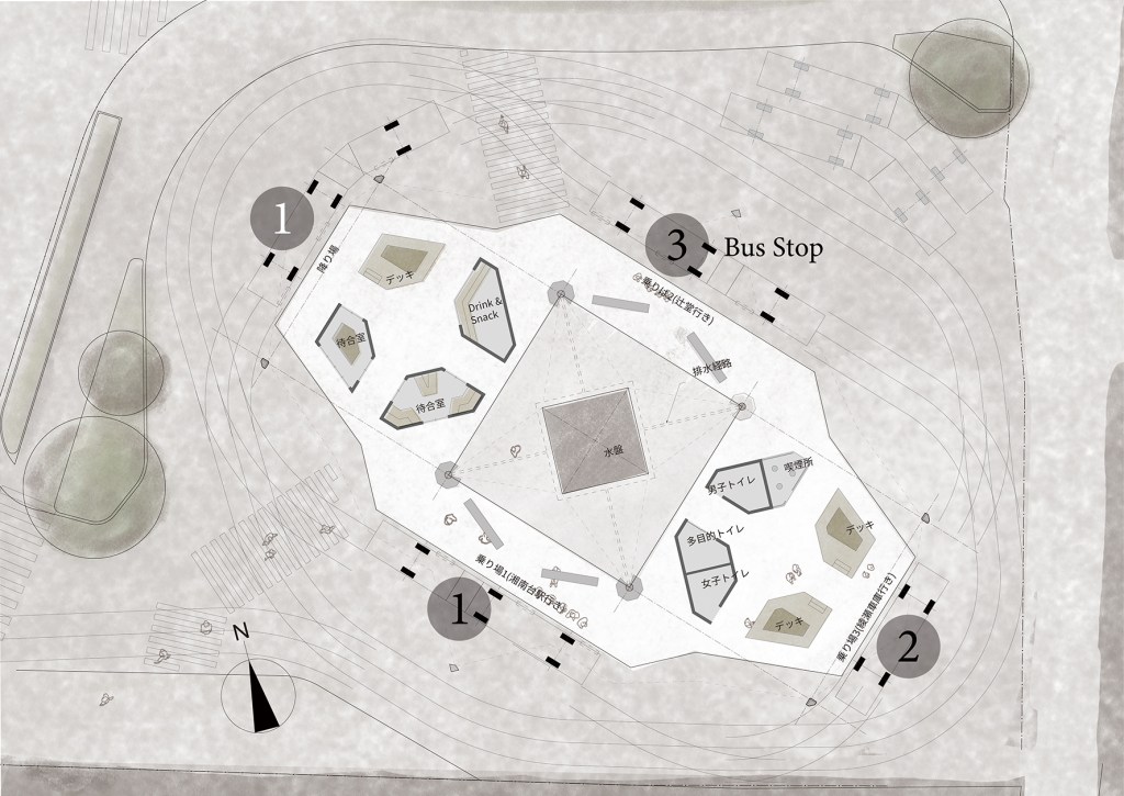 中央部に人が集まる導線にすることで、単なる移動施設だけではなく、広場のように人々が集い、時間を過ごす空間を目指した。大学構内のバスロータリーということで、学生同士、学生と地域とのコミュニティを形成する機能を持たせた。