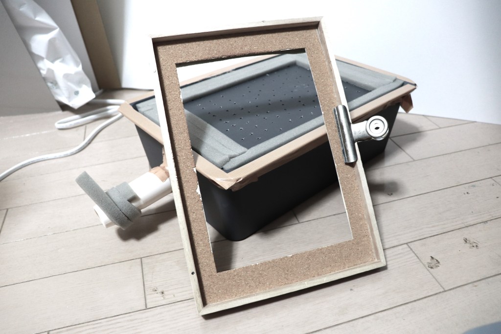 右下:作成したバキュームフォーム装置。主に100均で材料を用意した。