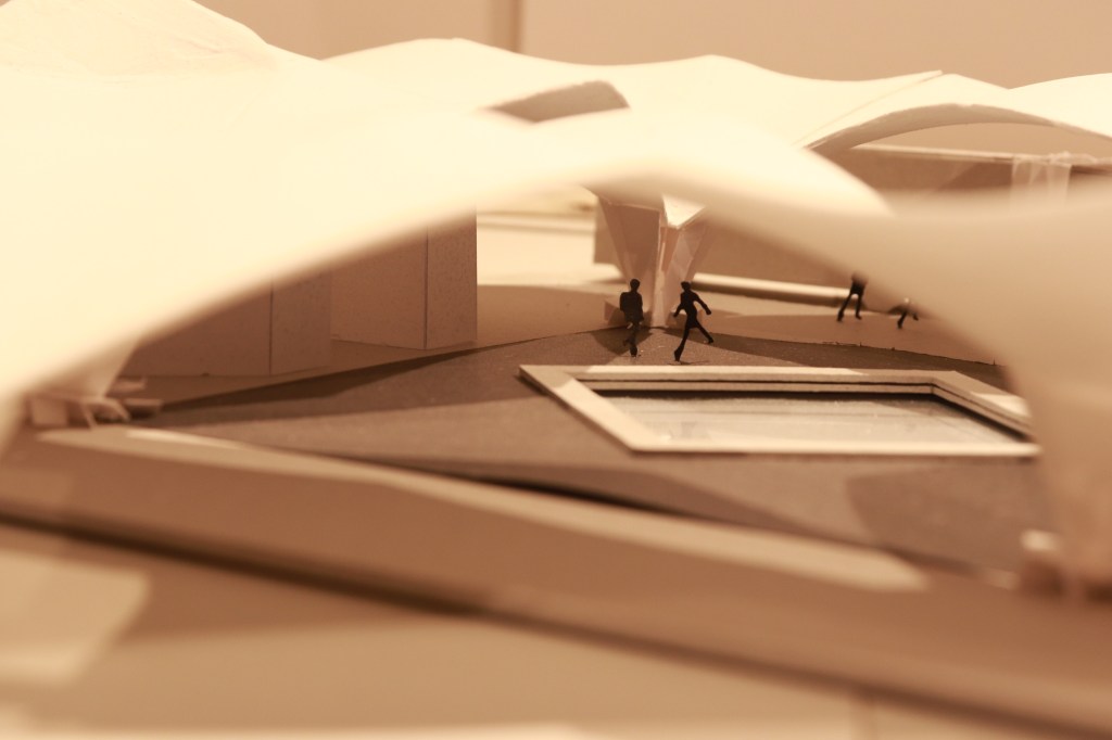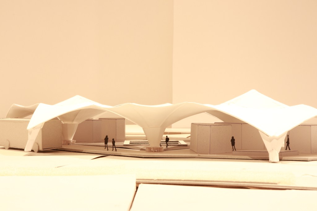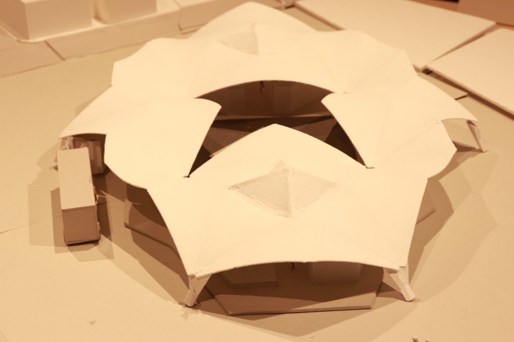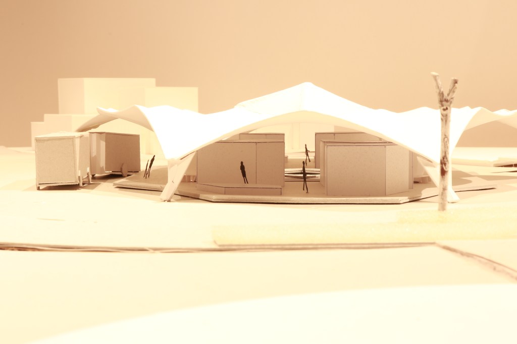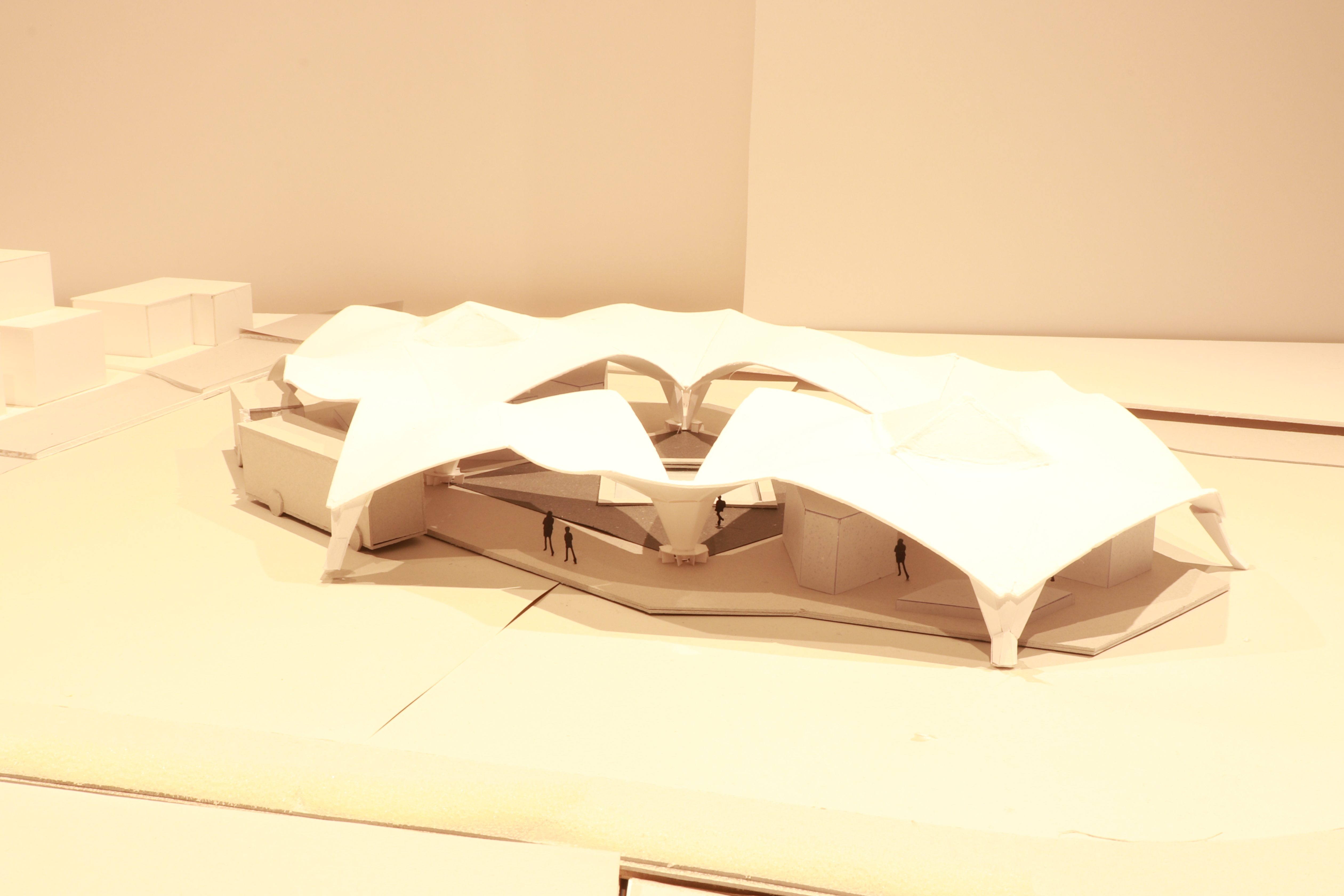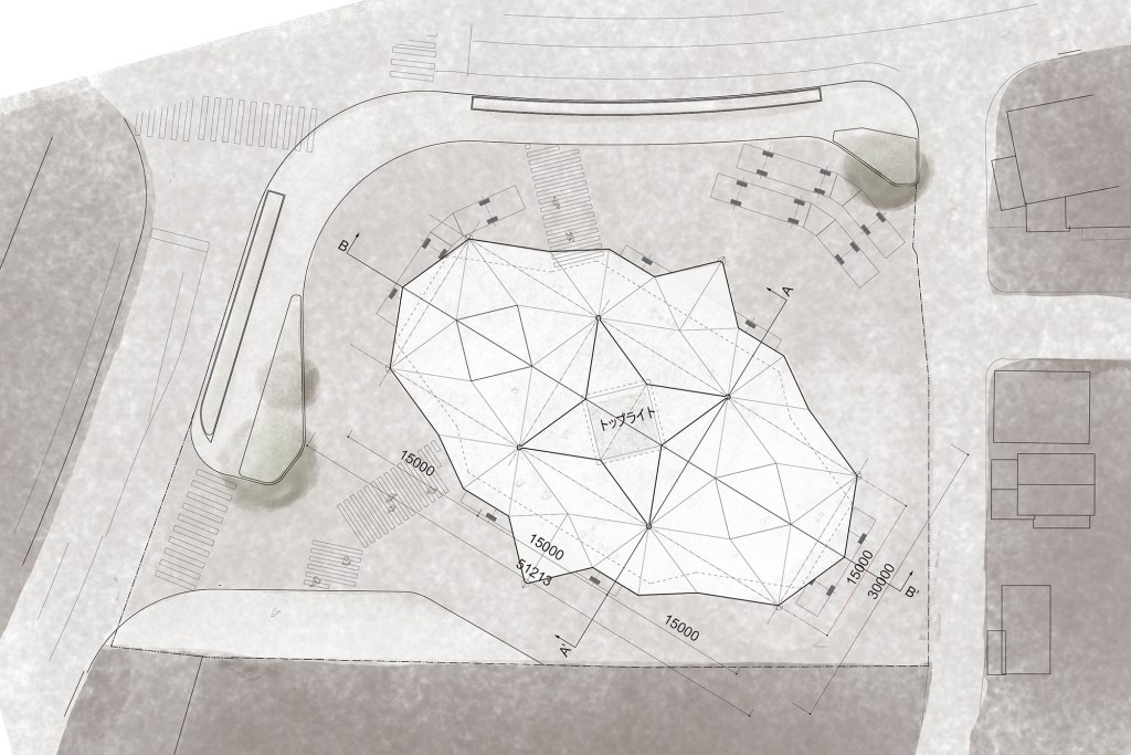 Sututtugart21[1994 ~ by Frei Otto]をモデルケースとし、シェル曲面を用いてバスロータリーの大屋根を設計した。モデルケースの大屋根は厳密には完全なシェル構造ではなく、一部分厚い鉄筋コンクリートをによって形状を担保していた。完全なHP曲面から任意の三角形を抜き出し、八角形に展開することで完全なシェル構造の傘を形成した。このシェル傘を連結させることで、構造合理性を持った大屋根を形成する。薄いシェル屋根のもと、人々が行き交い、思い思いの時を過ごす。