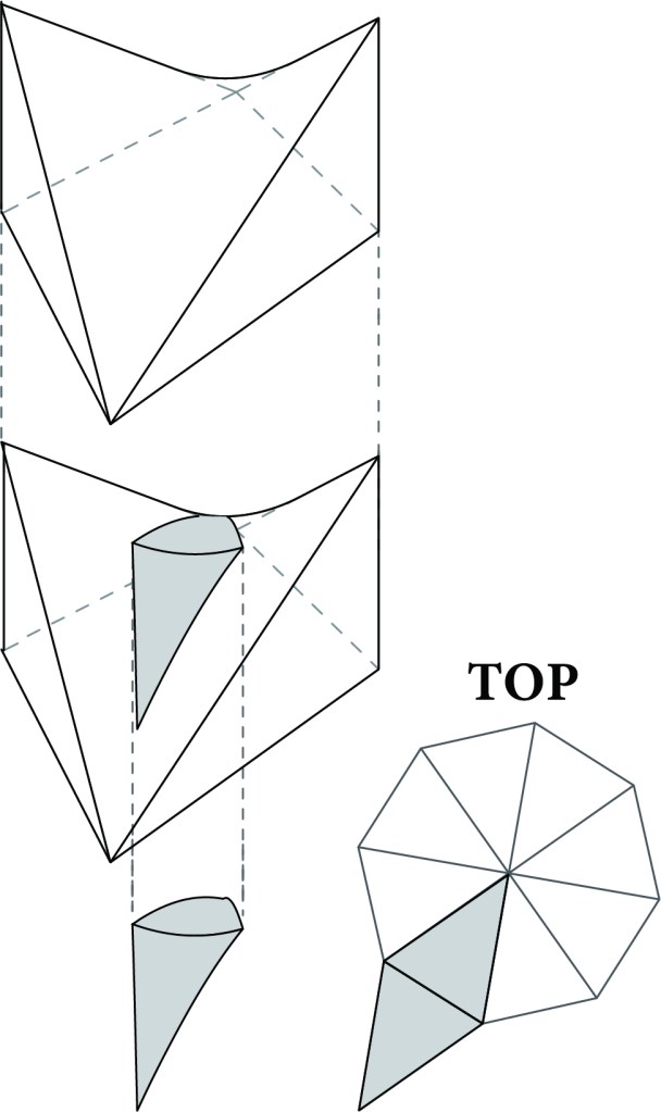 四角形のHP 曲面から三角形を取り出す。この三角形は八角形の対角線を引いた際にできる三角形を利用する。取り出した三角形シェルを八枚つなぎ合わせることで、TOP から見たときに八角形のシェルの傘形状が出来上がる。この方法を用いると、任意の多角形のシェル傘を形成することができる。