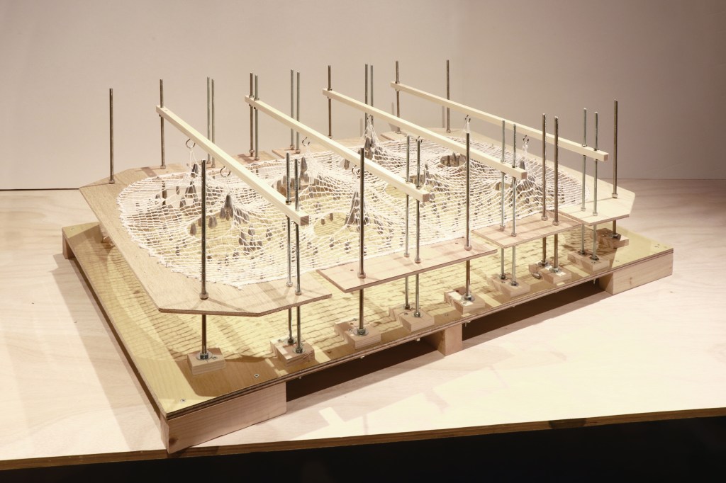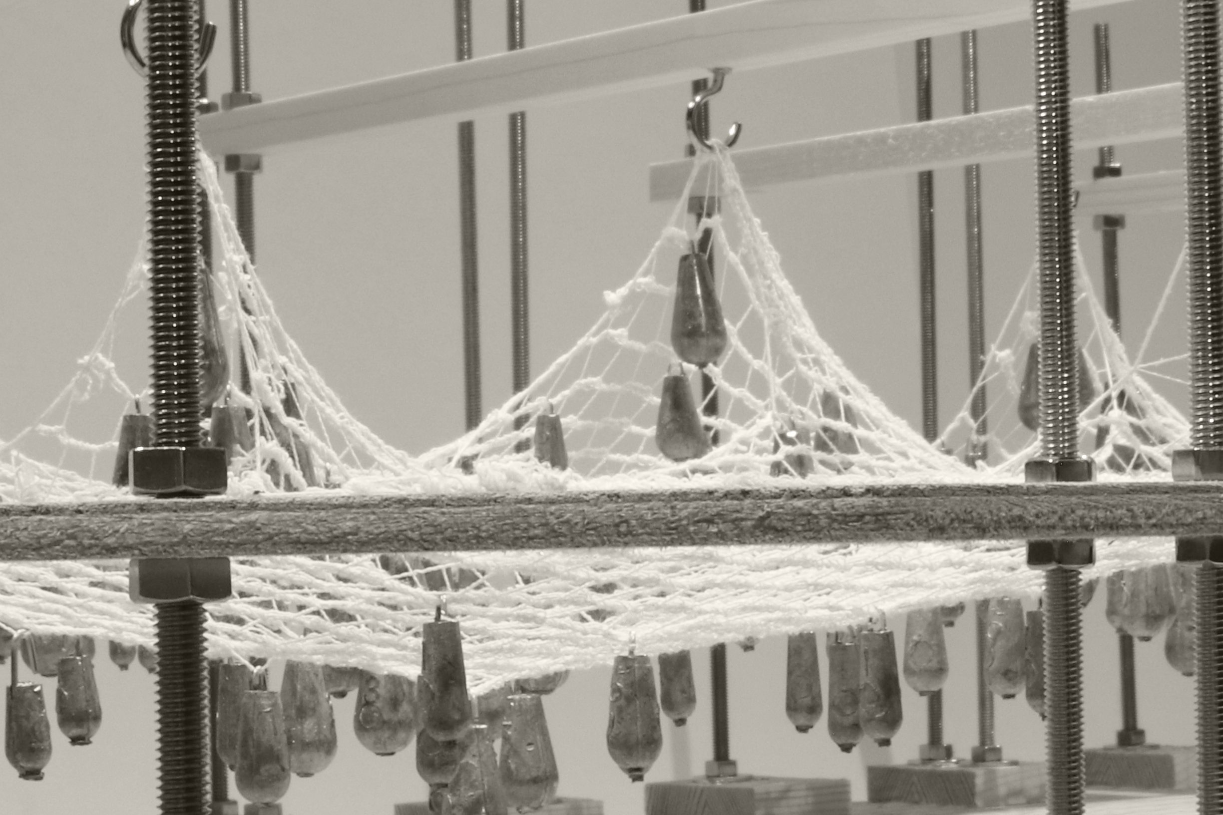 オットーの釣り模型を再現した。オットーはメッシュ生地に細かい錘(ピン?)のようなものを吊り下げ、曲面の造形を模索していた。今回は、メッシュの包帯に、釣り具の錘をできるだけ等間隔に吊るすことで重力荷重によってできる曲面を再現した。